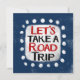 "O Vamos Viaja A Road Trip" é um design de texto bonito em azul com texto preto e vermelho. As palavras sentam-se em forma de sotaque branco cercado por pontos brancos bonitos.