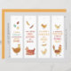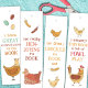 Estes adoráveis marcadores ilustrados de galinha são o dom perfeito ou o estocante para amantes de frango ou aqueles que adoram ler! Esta folha de modelo de marcadores apresenta quatro marcadores prontos para cortar com um design de canivete engraçado impresso na frente. Simplesmente corte cuidadosamente os quatro marcadores com tesoura ou um cortador de papel. Os marcadores acabarão sendo de aproximadamente 7,25" x 2" quando terminados. Aperte um buraco na área designada e fixe uma corda ou uma fita!