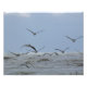 Uma fotografia de um bando de pelicanos pegando voo sobre o oceano.