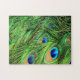 Penas de peacock pendem quebra-cabeça em verde e azul. O Pavão é um belo pássaro com uma grande mostra de penas quando abre a cauda para atrair um companheiro. É sempre o macho que é dotado com as belas penas.