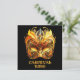 Uma máscara veneziana ornamentado apresenta ouro intrincado e designs pretos com penas amarelas vibrantes e letras douradas. O artesanato mostra elegantes escrolhos e cores vivas.