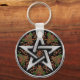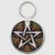 Pentagrama celta artístico design em metal prateado polido. Dragões que respiram fogo em vermelho e verde. Intrair a rolagem de canto. Um presente elegante para Wiccanos, Paganos, seguidores das religiões da Terra.