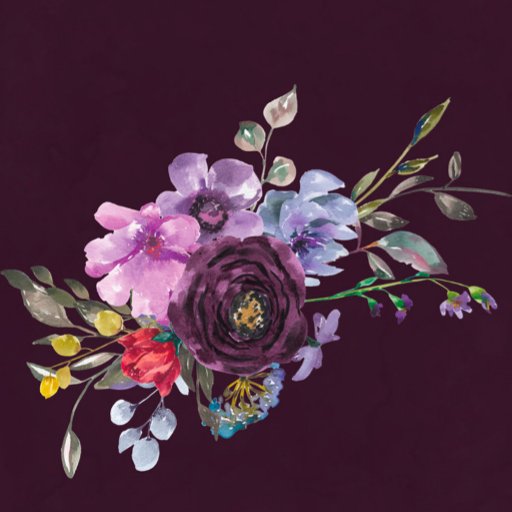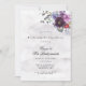 Design apresenta um elemento floral impresso em tons de ameixa e violeta sobre folhas de eucalipto verde e florescência de pénia sobre fundo de aquarela roxo. Excelente para as comemorações do casamento!