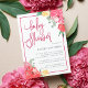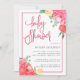 O convite para chás de fraldas elegante e moderno apresenta flores altas e coloridas aquáticas nos cantos. O "Chá de fraldas" aparece em letras de escrita manuscrita cor-de-rosa brilhante. Personalize com os detalhes do seu chá de fraldas, uma elegante letra de cinza azul. Cartões invertidos para listras cor-de-rosa e brancas fuchsia.