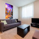 Uma pequena vila de pão de gengibre com mosca azul e alguma nuvem com um sol brilhante no céu. Esta é uma arte gerada por IA.