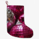 Meia de Natal elegante com uma coleção de enfeites de Natal cor-de-rosa e prateados brilhantes. Um design personalizável para você personalizar com seu próprio texto, imagens e ideias. Imagem criada usando uma fotografia original e técnicas digitais.