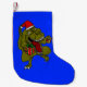 Um desenho de um T-Rex que veste um chapéu de Papai Noel e que guardara presentes em suas mãos.