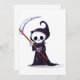 Quer um legal design, se não um pouco assustador, perfeito para o Halloween ou para os gostos e veja esse pequeno pastor. O rosto é assustador e incrível sozinho o resto. O pequeno ceifeiro está de pé num roupão segurando um machado. Este design de ceifa parece excelente nestes convites