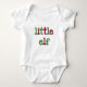 Pequenas T-shirts de férias do Elf, fatos-chave, sacos-tote e mais com texto brilhante vermelho e verde em estilo infantil.