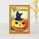 Um cartão de Dia das Bruxas maravilhoso, com um doce gato preto sentado em um jack o' lanterna. Cuidadosamente restaurado e dado um quadro estilizado.