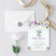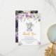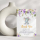 cartões de agradecimentos chá de fraldas com lindos roteiros, flores roxas e um adorável elefante bebê. O texto e as cores podem ser personalizados.