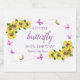 Uma borboleta está a caminho! Borboletas rosa, púrpura e amarela e rosas amarelas ensolaradas contra uma armação geométrica rosa