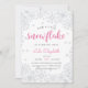 Brrr! Convites chiques para aniversários de inverno apresentam um fundo de silhuetas de cinza pálida com "nosso floco de neve está girando [idade]" em letras cor-de-rosa e cinza. Personalize com os detalhes da festa de aniversário de sua garotinha por baixo usando os campos de modelo. Cartões invertidos a rosas sólidas.