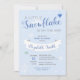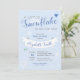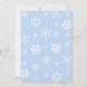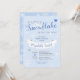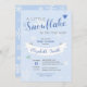 Design apresenta o texto "Um floco de neve a caminho" junto com flocos de neve azuis e brancos sobre fundo azul. O design é perfeito para um chá de fraldas de temas de inverno. O texto pode ser personalizável para ajustado das informações que você precisa colocar no cartão de convite.