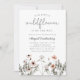 Convite para chá de fraldas de uma garota bonita com ilustração aquosa de flores silvestres rosa e brancas. O texto diz: "nossa flor selvagem está a caminho!"