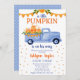 Este adorável convite para o Chá de fraldas do Little Pumpkin Boy com um carrinho azul de cor d'água carregado com bombas de queda seria perfeito para o seu chá! É fabuloso para celebrar um bebê do outono ou da colheita. Ele tem um dorso azul macio coordenado com pequenas bolinhas brancas. Tão fofo por acolher um doce bebê novo!