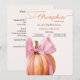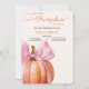 Pequeno Convite para Chá de fraldas de Abóbora - Tema de outono de Arco Rosa Celebra sua abóbora no caminho com este encantador convite para um chá de fraldas para uma garota. Apresentando uma abóbora aquarela amarrada com um delicado arco rosa, esse design é perfeito para criar um chá de fraldas aconchegante e elegante. Todo texto é totalmente personalizável com seus próprios detalhes.