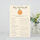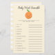 Uma pequena e bonita chá de fraldas, pequena placa de toque de palavras de bebê, com ilustração de uma fruta laranja num fundo amarelo neutro em termos de gênero. A lista de palavras neste cartão está relacionada com bebês e eles estão embaralhados. Os hóspedes vão competir quem pode desembaraçar todos eles primeiro! CHAVE DE RESPOSTA: 1. cadeirinho 2. leite 3. caneta de recreio 4. pacificador 5. fralda 6. cadeira de balanço 7. berçário 8. baby monitor 9. pastilha 10. fórmula 11. rolete de borracha 12.