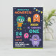 Incêndios aos seus convidados com este convite de festas primeiro aniversario fofo com adoráveis monstros com tipografia vibrante contra um fundo azul escuro. Basta adicionar os detalhes do seu evento neste modelo fácil de usar para torná-lo um convite de tipo único. Sacudir a placa para revelar um padrão colorido de listras na parte traseira da placa.