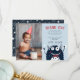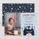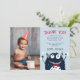 Cartoes de agradecimento planos fofos para o aniversário do seu pequeno monstro apresentam uma ilustração de um monstro sorridente com uma gravata borboleta vermelha elegante, em um fundo azul céu claro com letras azuis. Personalize com sua mensagem de agradecimento e o nome do aniversariante. Termine adicionando uma foto especial do aniversariante à esquerda. Projetado para combinar com nossos convites de aniversário e suprimentos para festa do tema Pequeno Monstro.