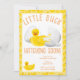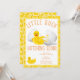 Pequeno Pato Atacando Em Breve Convite Para Chá de fraldas! Este adorável convite chá de fraldas para que a mãe esteja certa de que vai sorrir. Faça sua celebração para que a mãe seja tão aconchegante quanto um banho quente ou chá de chuva de verão leve. Esfregue este simples tema do pato de borracha para doces decorações felizes. Tem certeza de agradar aos seus convidados também!