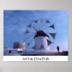 Um homem admira um dos famosos moinhos de vento na charmosa ilha de Mykonos, Grécia