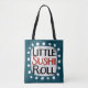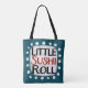 Uma design de comida tipográfica que diz "Pequeno Sushi Roll". É texto preto e vermelho em um retângulo branco com pontos brancos engraçados e brincalhões ao seu redor, todos sobre um fundo lacrimogêneo.