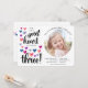 Querida, primeiro convite de aniversário. Corações cor-de-água roxos, azuis e cor-de-água rosa com uma foto sua, que logo terá três anos! Tons de joias em um fundo branco nítido, este convite é o mais doce.