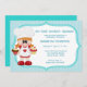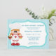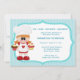 Convite de aniversário do garoto com um chef giro segurando dois bolinhos e vestindo um chapéu de chef. O fundo é listras azuis. Personalize com os detalhes do seu partido. gráficos ©KristiW