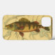 Esta impressão ilustra um quadro artístico de um peixe-perca amarelo. O plano de fundo exibe um mapa geográfico antigo em cores bege claro. A estrutura marrom se assemelha a um padrão antigo de madeira com flores amarelas-vermelhas nas bordas. Um excelente extra para a sua coleção de pesca!