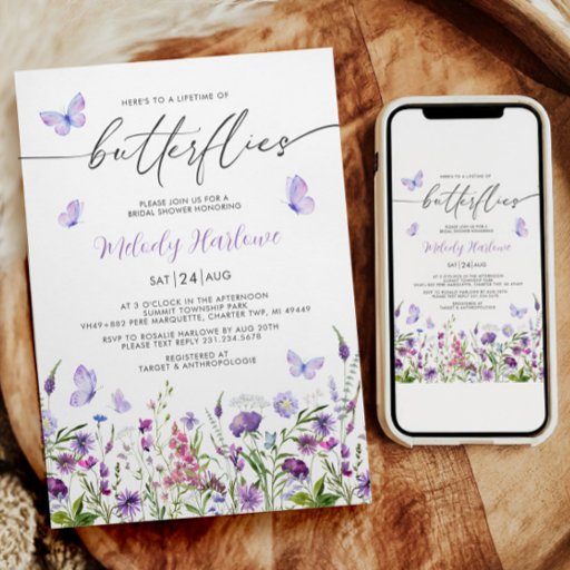 Embarque em uma jornada de amor e celebração com nossa coleção de Chás de panela encantadora! Inspirada pela delicada elegância das borboletas roxas e flores silvestres caprichosas, esta suíte de convite dá o tom perfeito para uma ocasião memorável.