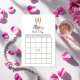 Adicione diversão e elegância ao seu chá de panela com este cartão de jogo de Pérolas, Pétalas e Bingo Temático do Prosecco. Apresentando delicados sotaques pérolos, óculos prosecco e um moderno design, este jogo é perfeito para manter os convidados entretidos enquanto celebra a noiva em estilo. Totalmente personalizável para corresponder ao tema do seu chá.