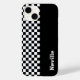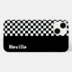 A black and white checkerboard design which fills one half of the item. You can change the colour of the design if you like. It is also personalised, so if you want to add your name or any other text, simply delete the text on the design before you start.