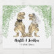 Aprecie seus convidados com esses bonitos dinossauros com rótulos de vinho personalizados de casamento. Noiva de dinossauro divertida e noiva em matizes marrons e folhagem de eucalipto com aquarela verde. T-Rex dino noiva e noiva com nomes fáceis de personalizar noivas e noivos e a data do casamento no moderno roteiro de tipografia caprichosa. Trabalho de arte único original de dino pela artista Catherine Sweetman