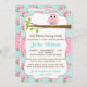 Este é um convite para chás de fraldas bonito que apresenta uma coruja em rosa sentada num galho. Você pode personalizar o convite para alterar o nome, a data e o local do chá. Altere a fonte, o tamanho, a cor e o estilo de acordo com as suas preferências. A parte traseira foi deixada em vazio para qualquer informação adicional que você queira adicionar.