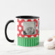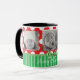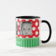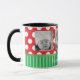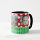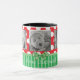 REd, arco verde, bonitinho, listras e xícara de café pontilhado de polca. Basta adicionar suas fotos favoritas de seus filhos, família ou animais de estimação. O texto diz, "Feliz Natal" mas pode ser editado na área personalizada para dizer o que você quiser.