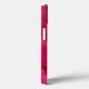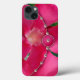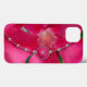A fotografia original de MaeFlowers neste caso do iPhone 13 é um close-up de uma flor rosa brilhante com pétalas abertas. As pétalas podem ver um fundo de folhas verdes. A design do caso é no estilo de um saco de embraiagem de tecido floral, com uma dobra sobre a aba esboçada em pérolas cor-de-rosa pálidas, e um fecho rosa redondo sombreado com uma pérola no centro. O centro da flor, perto do topo da bolsa, é um marfim amarelo macio que se mistura a rosa nas suas bordas externas ruborizadas.
