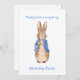 Peter, o coelho, "obrigado-te por vir à minha Festa de aniversário", no texto "Obrigado!" na parte de trás do cartão