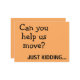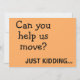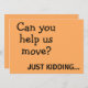 Este é um simples design de texto minimalista com duas fontes e uma sarcástica e engraçada piada na frente que diz: Você pode nos ajudar a nos mover? Só brincando...num fundo laranja vibrante. O verso diz: Mas nós conseguimos! Anote nosso novo endereço e há uma modelo de texto para você adicionar seu novo endereço ou você pode apagar essa peça e gravá-la manualmente. #endereço novo