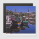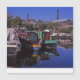 Heron empoleirado na proa de um barco estreito ancorado no Canal Floresta de Pico perto de New Mills Derbyshire Inglaterra