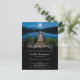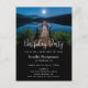 Cartaz convite de aniversário com uma bela fotografia de um píer de madeira esticado sobre um lago calmo. O céu noturno coberto de estrelas e uma bela lua de cheio.