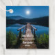 Etiquetas de preço com uma bela fotografia de um píer de madeira esticado sobre um lago calmo. O céu noturno coberto de estrelas e uma bela lua de cheio.