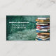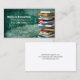 Uma pilha de livros fica do lado direito desta design, sobre um fundo verde esmeralda. Seu nome, título e contato aparecem em letras brancas em negrito na esquerda. Esta design de cartão de visita é especialmente adequada para as pessoas que trabalham no setor da educação ou na indústria acadêmica.