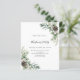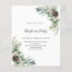 Fundo branco, decorado com cones de pinheiros, bagas brancas, folhas verdes. Personalize e adicione os detalhes da sua festa. Letras negras. 1 folha = 1 convite impresso de borda a borda.