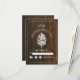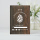 Um convite rústico e elegante da r.s.v.p., com ilustração de um cone de pínus branco sobre um fundo inspirado em madeira de celeiro.