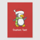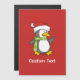 Um pequeno desenho animado de pinguim com chapéu de santa e cachecol verde andando na neve.