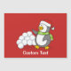 Um pequeno desenho animado de pinguim com chapéu de santa e cachecol verde acenando em frente a uma pilha de neve.