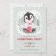 Convite de festas de Natal com um pinguim bonitinho na floresta nevada e neve vermelha do lado de trás. Personalize facilmente todo o texto. - Kate Eden Art