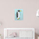 Um pinguim giro, com uma trilha branca e pontos cor-de-rosa, olha sobre um fundo azul gelado.