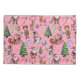 Christmas-themed pattern featuring Santa Claus, reindeer, snowmen, elves, Christmas trees, candy canes, and snowflakes on a pink background